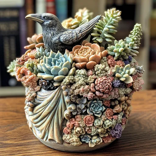 Midjourney Bot 更新时间:2026-03-21 00:03一款圆形的花盆上面浮雕着一只乌鸦站在自由女神像肩上,周围是一片花海,花盆里种植着多肉植物,背景是温馨的书桌。 --ar 1:1 --v 6.1 --stylize 82