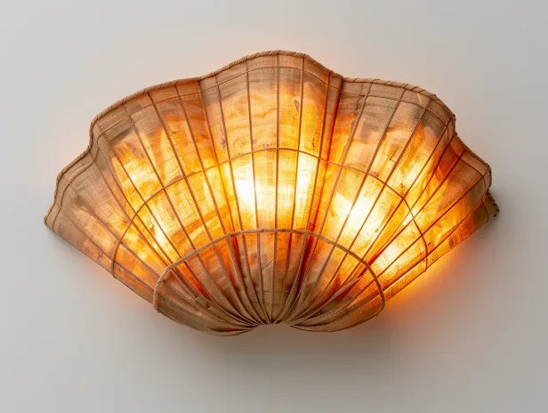 Midjourney Bot 更新时间:2026-03-21 00:03一盏以干燥玉米苞叶和玉米材质隔热垫为材料的侘寂风壁灯,底座为3D打印细网格骨架,玉米苞叶呈扇形平铺嵌入,边缘拼接玉米隔热垫的编织花边做装饰,背光源为暖黄色LED,光线穿透苞叶叶脉和编织隔热垫形成自然光影图案,整体形态不规则且有机,颜色为玉米苞叶原生色+隔热垫双色编织(米白、深棕),侘寂风格,壁挂式,纯白墙面背景,8K超写实渲染,重点突出玉米苞叶粗糙纤维与隔热垫精致编织的材质对比 --ar 4:3 --v 6.0 --style raw --stylize 100