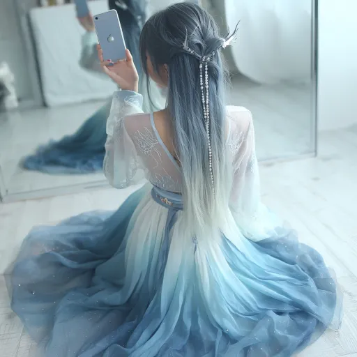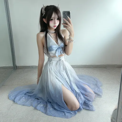 Midjourney Bot 更新时间:2026-03-21 00:02全身对镜自拍 有一个可爱的女生浅蓝渐变清透白长发,龙须刘海修饰脸型,两侧龙须碎发,高颅顶,发丝轻盈飘逸,带细闪珠光,清冷仙气,龙角发饰适配,长发及腰穿搭清透蓝白渐变纱裙露腰设计,龙纹刺绣,轻纱飘带,泡泡袖,水色渐变大裙摆珍珠配饰,绑带高跟鞋,,侧身坐姿坐在地上 长腿伸直,不露脸,微微低头身体放松慵懒,只展示身形和,在镜子前面 手机挡住全脸 不显示镜框边 --ar 1:1 --v 7 --stylize 100 --oref https://images.gogpt.vip/aigf/m_origin/20260320/1860757/601tfseabv5a9xxw.png --ow 35