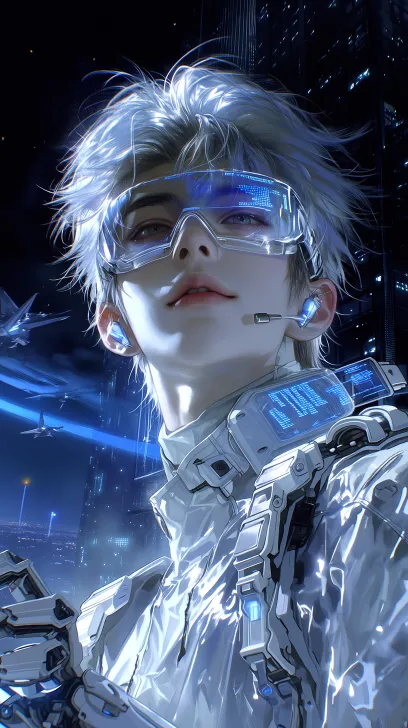Midjourney Bot 更新时间:2026-03-21 00:05核心主体:赛博朋克风格亚洲男性角色,银白渐变短发(两侧剃短,顶部蓬松炸起),五官精致立体(高挺鼻梁、清晰下颌线、薄唇微抿、睫毛长,根根分明,灰黑色锐利眼眸),蹲在未来都市天台边缘,身体微侧,直视镜头,透明屏幕款护目镜(露出眼部,护目镜上半部分为透明全息屏幕,显示蓝色代码数据流),机械义肢右臂(白色装甲外壳+外露机械结构+蓝色全息显示屏),白色高领紧身战斗服,肩部白色发光装置,耳戴科技感耳机,向镜头伸出手 场景氛围:夜晚,未来都市天台,浮空飞行器,蓝色光带(蓝色),高空城市景观,黑蓝色夜晚天空,赛博朋克都市背景高楼霓虹 光影与质感:写实3D渲染,电影级光影,金属质感,全息光效,高清细节,8K分辨率,干净明亮色调,科幻感 --ar 9:16 --stylize 1000 --niji 7 --no 精灵耳