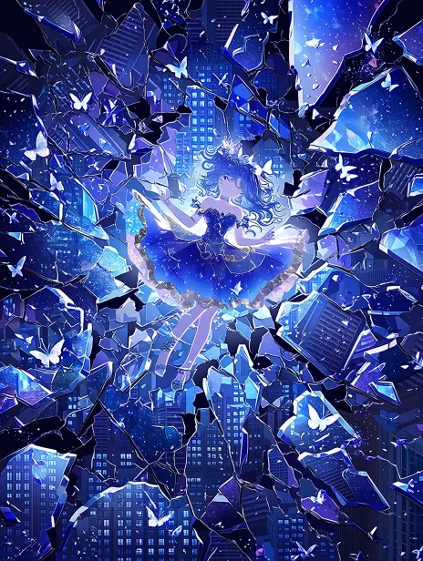 Midjourney Bot 更新时间:2026-03-20 00:05梦幻蓝紫蝴蝶少女插画,二次元厚涂风格,中心是浅蓝长卷发少女,身着蓝金渐变蕾丝礼服,周围环绕破碎镜面与蝴蝶碎片,背景是破碎城市废墟与星空,层叠拼贴结构,高饱和度蓝紫渐变色调,通透水晶质感,光影破碎迷离,充满空灵、破碎、梦幻的氛围,高细节,8K分辨率,无人物以外多余文字,比例 21:9 --ar 3:4 --stylize 100 --niji 7