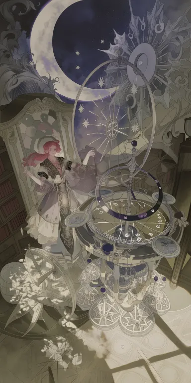 Midjourney Bot 更新时间:2026-03-20 00:06商业插画渲染,二次元塔罗风格,神秘主义元素,中世纪花纹装饰,马戏团元素装饰,一个红发女祭司,站在巨大的占星仪器面前,背后是图书柜子和巨型的天文望远镜,天空有巨大的月牙,行星模型和地月结构的地球仪 --ar 1:2 --stylize 109 --niji 7 --sref https://images.gogpt.vip/aigf/m_origin/20260220/140639/t73j9suxwfzhv3qk.png https://images.gogpt.vip/aigf/m_origin/20260220/140639/a7ou9sr36eidfrxe.png https://images.gogpt.vip/aigf/m_origin/20260220/140639/7k3f07puturs1vrr.png --sw 249