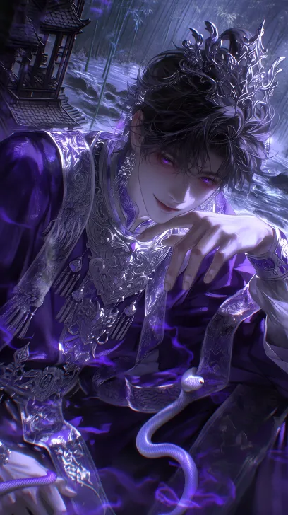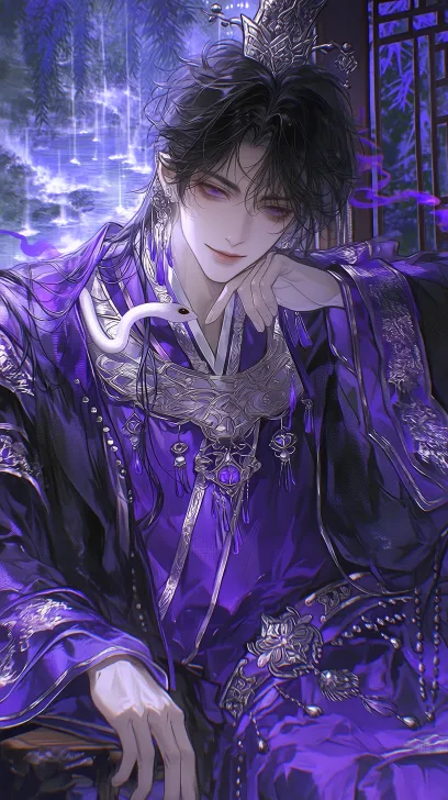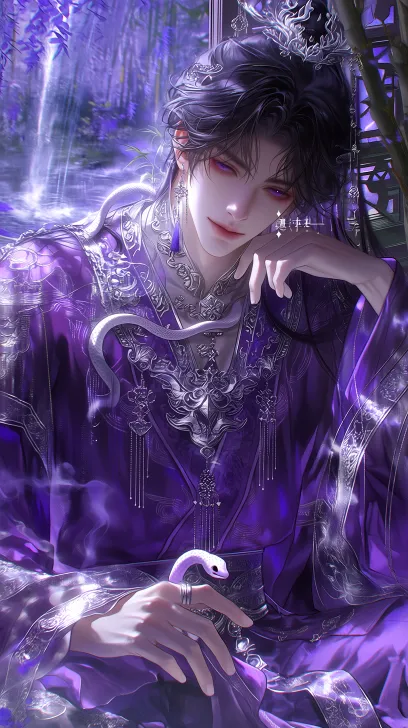 Midjourney Bot 更新时间:2026-03-20 00:12俊美痞帅中国古代苗疆长发少年,墨色长发,头上有复杂苗疆发饰,身姿清俊,面容浓昳丽俊美妖艳,紫色眼眸,眼尾泛红,耳朵上有银质华丽耳饰,一身紫色苗疆风格男装,银质苗疆颈环,衣服材质飘逸柔软,民族风元素,五毒绣纹,流苏披肩,衣着松垮,腰间有银铃流苏装饰,衣服有零散绣纹,妖艳俊美懒散气质,神情魅惑帅气深情,微笑邪魅,身上挂一条白紫色小蛇,手部互动,面部特写细致,斜侧下方向上拍摄,半身像,近景,背景苗疆紫竹林吊脚楼,流水清泉,紫烟特效。半厚涂写实,2.5D质感,迷幻光影层次,特效渲染,电影感半身构图,高清锐利4K画质,画中画/框架构图,厚涂,细节丰富,伪bjd脸,伪真人感,极致光影,极致面部特写,和谐配色,对比强烈,聚焦面部,清透感,精致眉眼,清晰聚焦,半厚涂写实,插画构图,数码高清写实,理光gr质感,头像脸部特写镜头,光影层次立体,古风,国风,精致,4K画质 HD,黄金时刻,杰作,masterpiece,best quality,真实细腻质感 --ar 9:16 --stylize 455 --niji 7 --no 短发 short hair