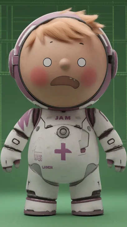 Midjourney Bot 更新时间:2026-03-20 00:063D C4D 风格,泡泡玛特潮玩 IP,2.5 头身比例,圆润包子脸搭配两团淡粉色腮红,超大圆形车轮瞳孔灵动可爱。头戴 oversize 亮黄 / 荧光绿儿童赛车头盔,表面满铺星星、火焰涂鸦贴纸,造型笨拙充满童趣。身穿宽松连体儿童赛车服,白底色搭配荧光撞色线条,胸口点缀精致闪电刺绣标志,整体风格软萌治愈,潮玩质感拉满 3D模型, --ar 9:16 --c 65 --weird 1416 --stylize 738 --niji 6