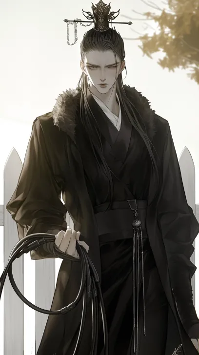Midjourney Bot 更新时间:2026-03-20 00:07一个俊美美貌男人,漂亮的男性,高马尾,九旒冕,黑发和苍白的肌肤,穿着黑色色毛领()汉服,西部战争,手里拿着鞭子,站着,身后是白色篱笆墙,眨眼,白天背景,数字艺术风格,风格为克里斯·邓恩 --ar 9:16 --style raw --stylize 100 --niji 6 --no no