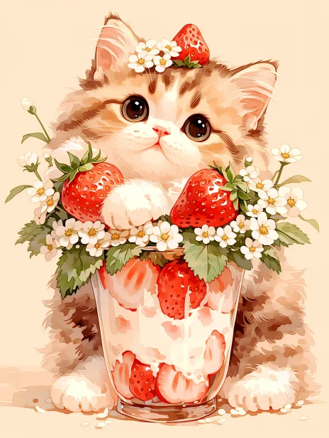 Midjourney Bot 更新时间:2026-03-20 00:09巨大黑白长毛猫,呆萌大眼睛,身体由草莓、奶油漩涡、花朵、绿叶组成,复古童话绘本风,儿童插画,水彩质感,扁平风,暖粉橙色调,治愈甜美,8K高清,竖构图 --ar 3:4 --c 18 --weird 24 --stylize 347 --niji 7