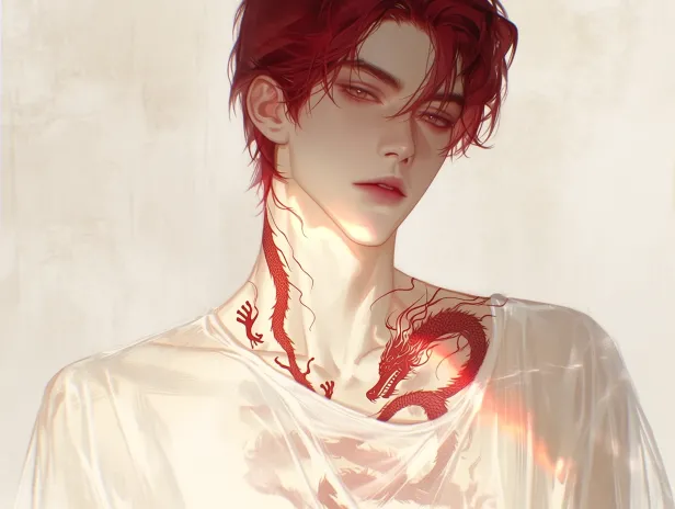 Midjourney Bot 更新时间:2026-03-20 00:11画面中是一位气质独特的男性角色。他有着一头酒红色的短发,发丝蓬松且富有层次感,在光线轻抚下泛着丝绒般的光泽,随性又不失精致。白皙的肌肤如瓷玉般细腻,脸部轮廓立体深邃,眉眼间带着慵懒的疏离感,那双琥珀色的眼眸似藏着一汪幽潭,唇色淡粉却因神情添了几分清冷。 他身着一件半透明的白色短袖,轻薄的面料如蝉翼般贴肤,隐约透出内里的身形,在朦胧中勾勒出优雅的肩线与流畅的颈项。最引人注目的是自脖颈蔓延至肩头、胸膛的红色纹身——那图腾如燃烧的火焰,又似腾跃的真龙,赤红线条肆意游走,笔触张扬却不失章法,在素白衣物与肌肤的映衬下,恍若跳动的火苗,为角色镀上一层神秘而危险的气息。 背景以浅淡的底纹虚化,让焦点全然落在人物身上,暖调光影轻笼周身,将他妖冶与清冷交织的气质烘托得淋漓尽致,仿佛他是从奇幻秘境中走出的异人,每一处细节都暗藏着不为人知的故事,那抹艳红在纯白里绽裂,撞进视线时,既惊艳了时光,又勾住人心底的好奇与遐想。 --ar 4:3 --stylize 100 --niji 7