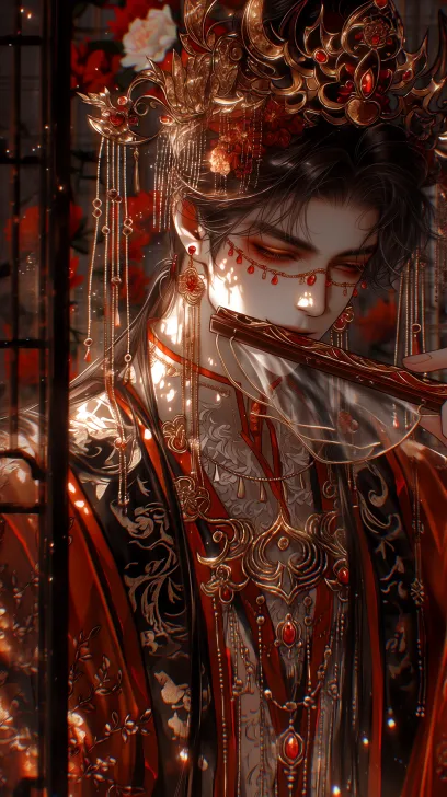 Midjourney Bot 更新时间:2026-03-20 00:12Cg质感,bjd,古风美男,画面色彩浓烈,超惊细,男性,苍白冷白皮,精致五官,绝美,琥珀色眼睛,狭长眼,红色眼妆,眼下细闪,睫毛长,根根分明,微笑,浓密黑长发梳成复杂高髻,佩戴华丽亮金亮红相间的发冠、珠翠步摇与红色花朵发饰,额间垂挂金色流苏额饰,随风飘荡,多层华丽金红宝石项链,红黑金配色古风长袍,衣袍绣有金色月牙与缠枝花纹,透明纱质外衫,花瓣飘落,他拿着一个折扇,丝绸折扇子,扇子遮住口鼻,与衣服同款花纹,半遮脸,眼神妩媚,黑色木格窗,背景是朦胧中式花窗与红白牡丹,侧光,红光,暖色调,细节丰富,前景虚化。画面明亮精细。 --ar 9:16 --stylize 463 --niji 7 --no 精灵耳