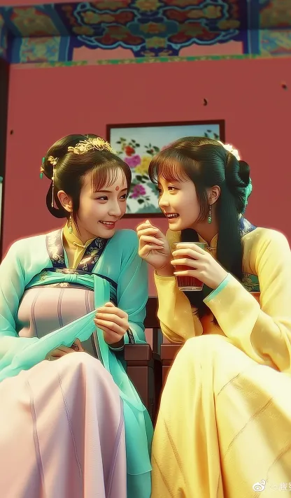 Midjourney Bot 更新时间:2026-03-20 00:12https://images.gogpt.vip/aigf/m_origin/20260319/2094466/07h2d83f9kobh4wm.jpg 两位身穿传统汉服的女性坐在一起,氛围温馨而典雅。左侧女子穿着蓝色和淡紫色相间的衣裙,头饰精致,手中拿着一条轻盈的披肩,面带微笑,显得娇羞而温柔。右侧女子则穿着明亮的黄色衣裙,手中握着一杯饮品,神情投入,似乎在低声和左侧女子交流。背景是温暖的红色墙面,上面装饰着传统的图案,营造出一种古典而舒适的环境。整体画面注重细节,展现出优雅的气质与和谐的氛围。 --sref 700 --ar 7:12 --stylize 100 --iw 1.5 --niji 7 --sref https://images.gogpt.vip/aigf/m_origin/20260319/2094466/9z74dcvi45vny0jo.jpg --sw 800