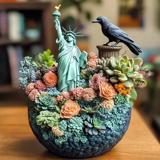 Midjourney Bot 更新时间:2026-03-20 00:13一款圆形的花盆上面浮雕着一只乌鸦站在自由女神像肩上,周围是一片花海,花盆里种植着多肉植物,背景是温馨的书桌。 --ar 1:1 --v 6.1 --stylize 82