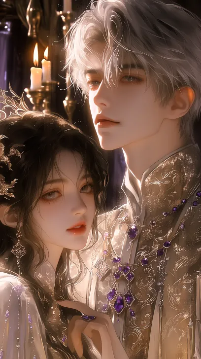 Midjourney Bot 更新时间:2026-03-19 11:18绝美古风男性角色,银发金挑染,柔顺长发,半竖起,发间点缀金色发钗,白色龙角, • 清冷贵气帝王气质,灰金色眼眸,长睫毛,看镜头,精致立体五官,苍白皮肤,唇色偏红 • 身着鎏金刺绣龙纹古风长袍,多层交领设计,搭配多层紫色宝石项链 • 背景为祭坛黄昏,贡品,蜡烛,室外,暖金色侧光,电影感光影,暗紫色冷调氛围 • 近景脸部特写,对角线构图,人物居中,手部微抬,姿态优雅疏离 • 华丽暗黑哥特古风,唯美精致,高细节,8K分辨率,写实厚涂风格 --ar 9:16 --stylize 463 --niji 7 --no 精灵耳