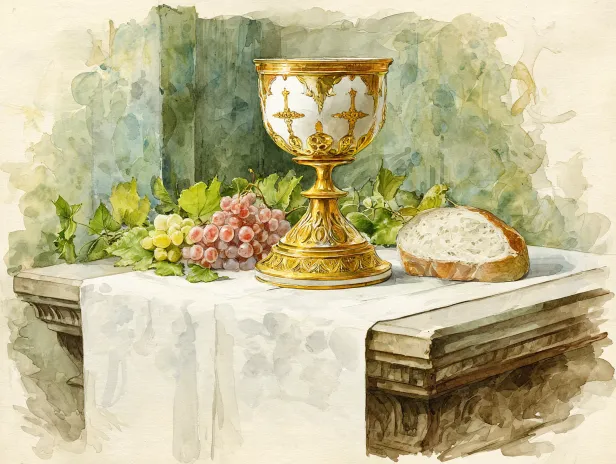 Midjourney Bot 更新时间:2026-03-19 11:20一张桌子上铺着白色桌布,桌布一直延伸到地上,桌子正中间有一个金色圣杯,圣杯上有白色的十字架花纹的蛋,圣杯左边是葡萄,右边是面包,还有尤加利叶和小麦装饰,背景是白色,正视图,整体色调为绿色,水彩风格 --ar 4:3 --v 7 --stylize 100