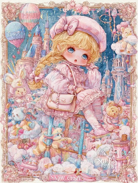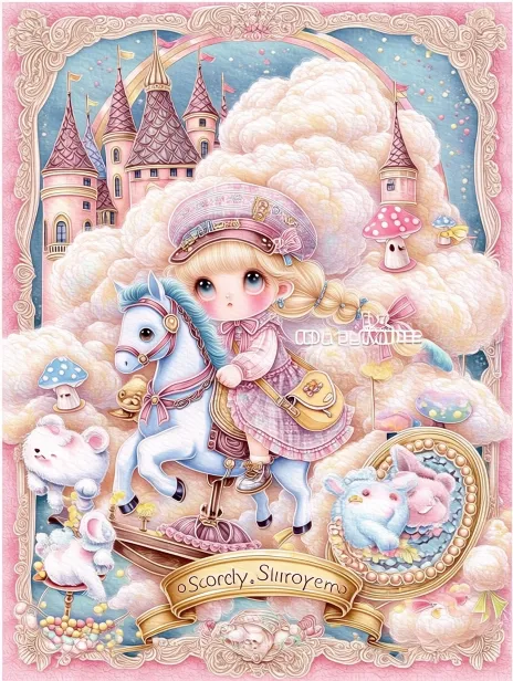 Midjourney Bot 更新时间:2026-03-19 11:20https://images.gogpt.vip/aigf/m_origin/20260221/2061538/crqni3xyklrbt9eq.JPG https://images.gogpt.vip/aigf/m_origin/20260312/2061538/k4xegil9eduevsxw.jpg https://images.gogpt.vip/aigf/m_origin/20260222/2061538/qqp3vhxn7qo7f3ad.jpg 一位Q版小女孩,麻花辫,戴着贝雷帽,斜挎包,在坐旋转木马,身边围着小熊,周围点缀Q版小木马和小熊,前景是棉花糖般的云朵,云朵上有彩色的小蘑菇,右下角点缀气球,背景有梦幻城堡轮廓,欧式城堡极尖顶,梦幻的马卡龙配色,整体有童话故事的风格,有层次的构图,饱满的构图,极致的细节,欧式风格边框,内框有一圈小珍珠,复杂的边框,极致的细节,边框点缀小羊,边框极致的细节 --ar 3:4 --v 7 --stylize 890 --iw 1.5 --sref https://images.gogpt.vip/aigf/m_origin/20260221/2061538/ma8qd28wgc59zicb.JPG --sw 1000 --no 残缺的四肢,畸形的四肢