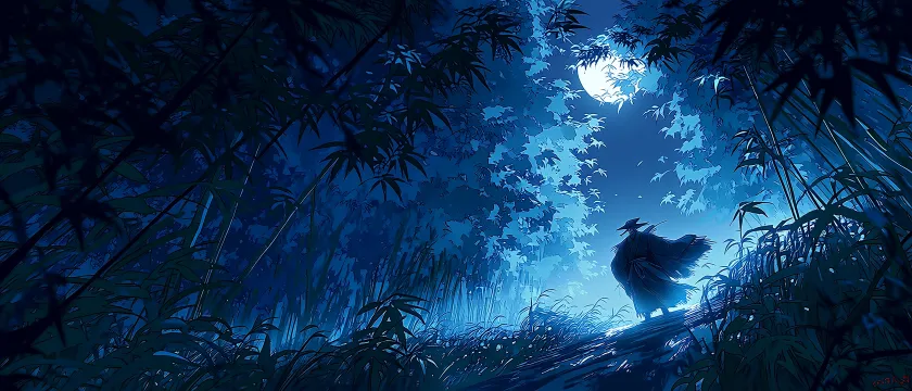 Midjourney Bot 更新时间:2026-03-19 11:20金铨武侠电影风格,广角胶片镜头,白衣大侠,独行于竹林小径,深蓝夜幕笼罩,月光穿透竹叶形成斑驳光斑,麻布衣襟随风翻飞。 --ar 21:9 --seed 1142842563 --stylize 100 --niji 7 --no 看清脸 文字