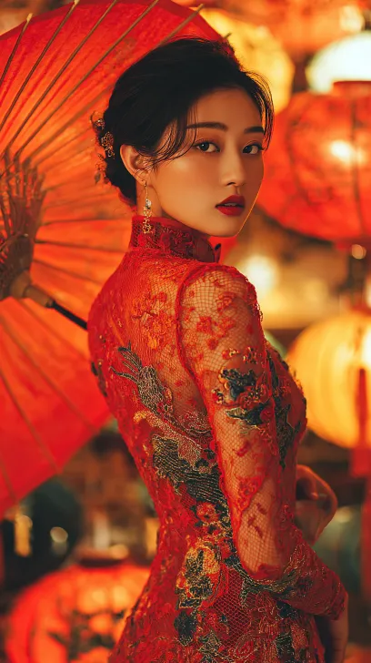 Midjourney Bot 更新时间:2026-03-19 11:23传统剪纸汉服女子持剪纸, 剪纸镂空华丽长袖衣服, 背景为温暖的灯光与红色油纸伞, 营造出节日氛围, 细腻的发饰与优雅的姿态, 超高清细节, 温暖自然光, 视觉上引人入胜的场景。 超现实主义,电影质感, 细腻肤质,16K质量,剪纸,中国结,中式服装, --ar 9:16 --v 7 --style raw --stylize 100