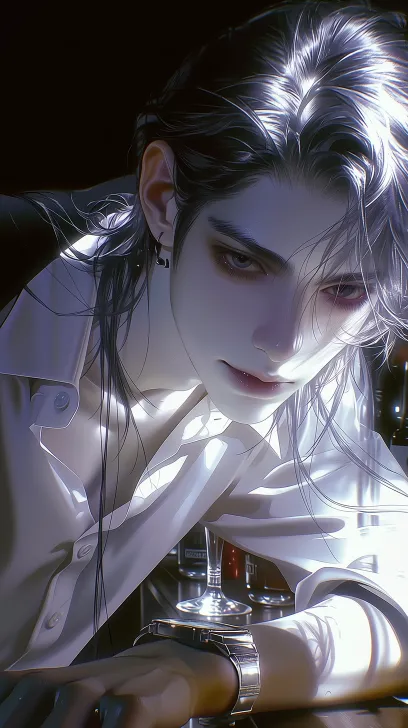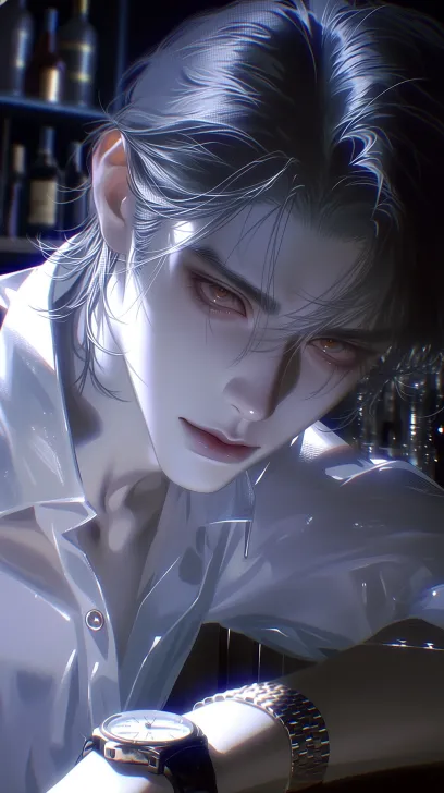 Midjourney Bot 更新时间:2026-03-19 11:24https://images.gogpt.vip/aigf/m_origin/20260314/2045420/pyep20zg2iprnalr.png https://images.gogpt.vip/aigf/m_origin/20260311/2045420/2j8w0629d9hd85eb.png https://images.gogpt.vip/aigf/m_origin/20260318/2045420/yby6r5ir915812ud.jpeg 二次元伪厚涂真人感插画风格,笔触感强烈:一个可爱的18岁男孩,黑发刘海向后梳起,发丝纤细通透;冷白皮,桃花眼上挑的眼角,眼眸清冷湿润,根根分明的纤长睫毛;冷白肌肤呈现超写实厚涂质感,水润玻璃唇,黑色的瞳孔,高挺鼻梁表情似笑非笑,白色衬衫第一颗纽扣解开露出若隐若现的锁骨,袖子挽起至小臂,大臂上有一个臂环,手撑在酒吧吧台上,手腕戴着一块手表,身后是高端酒,特写镜头,人物轮廓光,冷调伦勃朗光,明暗对比强烈,光影绚烂通透,戏剧性的色彩张力 --ar 9:16 --c 15 --stylize 175 --niji 7 --no 戒指,耳环,项链