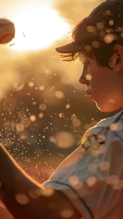 Midjourney Bot 更新时间:2026-03-19 11:24构图与光影: 采用电影感构图(或适合手机竖屏的上下留白构图)。画面主体是一名少年投手的上半身特写,他刚完成投球动作,球即将离手。阳光从左侧45度角逆光照亮他扬起的脸庞和溅起的汗珠,营造出“春分日”特有的温暖长阴影。 节气融合: 背景虚化: 投手后方,棒球内野的红土与刚返青的草坪界限分明。远处看台后方,一株满开的樱花树(或玉兰)枝头微颤,花瓣被风吹向球场,其中一片恰好落在画面右下角的捕手手套上。 天空细节: 天空是春分特有的清澈淡蓝色,有归来的候鸟(燕子)排成人字形飞过,极其细小,需放大才能看清,增加画面纵深和意境。 质感表现: 棒球手套的皮革纹路、球衣布料褶皱、投手丘上的红土颗粒、汗湿的头发丝,均需高精度的细节渲染。 2. 配色方案: 主色调:经典棒球红土色(赭石红) + 草地绿(深翠绿)。 点缀色:樱花瓣的淡粉(极克制使用) + 阳光的金黄。 整体调性:带有纪实摄影的质感。 --ar 9:16 --v 6.0 --stylize 100