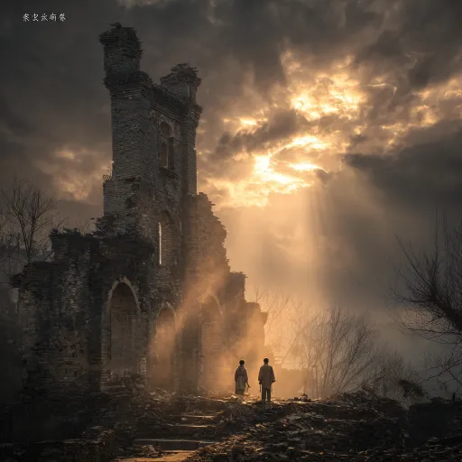 Midjourney Bot 更新时间:2026-03-19 11:26水墨古风,夕阳下的废墟宫殿,两道少年剪影立于残垣之上,金光穿透乌云,空灵氛围,悲壮中带着希望,4K,高细节。 --ar 1:1 --v 7 --stylize 100