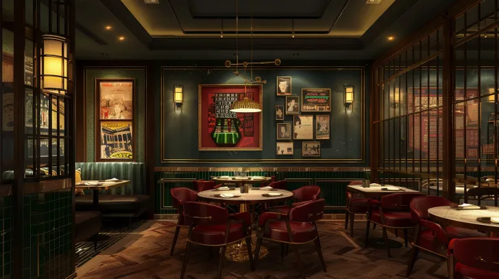 Midjourney Bot 更新时间:2026-03-19 11:26包房 一、核心风格关键 复古港式、电影主题港风、新式复古港风、市井烟火气、沉浸式怀旧、暗调高级、暖光氛围、电影感光影、港片美学、精致复古 二、空间与结构关键词 餐厅包房、私密用餐区、电影主题展示墙、木格栅隔断、二级吊顶、玄关过渡区、圆桌用餐区、观影展示区 三、材质与色彩关键词 胡桃木护墙板、墨绿色复古小方砖、黑金金属线条、水磨石地面、人字拼木地板、复古小花砖、做旧金属、拉丝黄铜、酒红/深棕皮质、丝绒窗帘、艺术漆墙面 四、灯光与氛围关键词 暖黄无主灯、洗墙灯、暗藏灯带、复古筒灯、电影灯箱、壁灯氛围光、餐桌轨道灯、暗调光影、柔和漫射光 五、文化与细节关键词 港片海报墙、复古放映机装置、胶片装饰、繁体文字标识、老香港街景画、电影票根展示架、港式茶水台、怀旧摆件。 港式复古电影主题餐厅包房,胡桃木护墙板拼接墨绿色小方砖,黑金金属线条分割,水磨石地面,暖黄无主灯氛围,电影海报展示墙,复古放映机装置,酒红皮质座椅,木格栅半隔断,暗调高级感,沉浸式怀旧烟火气,8K高清写实渲染 --ar 16:9 --v 6.0 --stylize 100