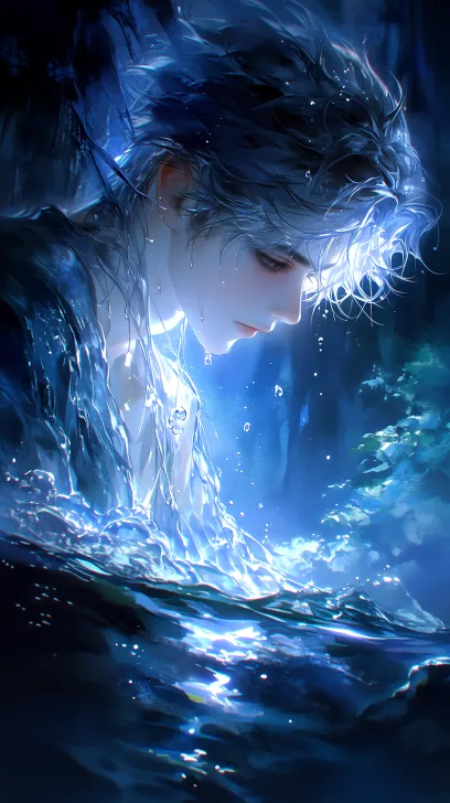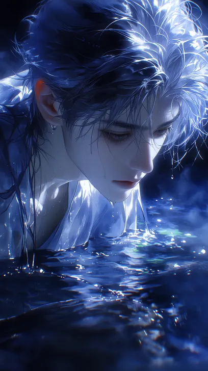 Midjourney Bot 更新时间:2026-03-19 11:268k ultra high resolution,顶级CG插画,伪厚涂技法,水墨风意境,漫画光影,极致美丽,妖异惑人的少年感。 主体描述:一位面容昳丽的古风美少年,非常年轻,脸部线条柔和圆润,五官精致,美的雌雄莫辨。冷白皮,面部呈现高曝光效果,肌肤白到发光,带有通透感。浅色眉睫,薄唇浅淡水润有光泽。玉色琉璃瞳,眼尾上挑,眼帘低垂,神情清冷病娇。 发型与服饰:冰蓝色超长发,四六分斜刘海,凌乱的发丝沾满水汽,正滴落水滴,部分漂浮在深色水面上,随波晃动,带有细碎光点。身披被水打湿的轻薄古装,身形单薄,腰肢纤细。 姿态与场景:半身侧面特写,侧脸,俯拍角度。少年浸泡在深蓝近黑的池水中,上半身趴在池边石阶上。潭边有莹蓝幽绿的雾气飘浮环绕。深夜,弦月高悬,月光透过迷雾,在幽深的池面上投下朦胧光影。 光影与色彩:光影对比强烈,冷白光从正面和侧面照射,营造出高光区域和深邃阴影。整体以蓝色系为主色调,色彩和谐,梦幻朦胧,柔光渲染,流光溢彩,皮肤和衣服上有琉璃般的光泽质感。 构图:广角镜头,中等距离,极富动感,细节精致。 --ar 9:16 --stylize 1000 --niji 7