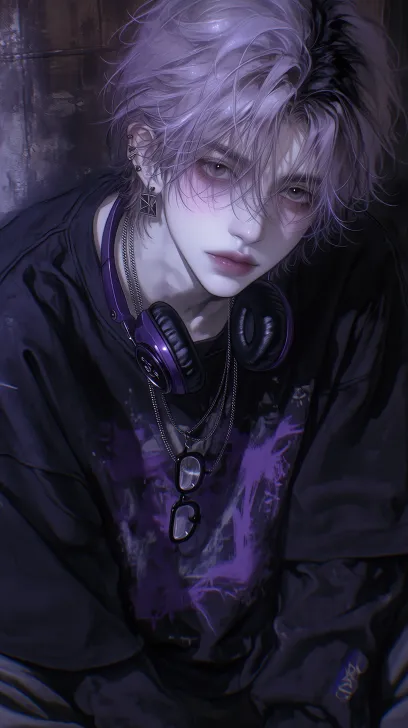 Midjourney Bot 更新时间:2026-03-19 11:27高级CG bjd 少年 26岁左右 高级厚涂 头发蓬松发丝凌乱 高清画质 穿着潮流 浅紫色头发(头发有一根黑色挑染)穿着潮流 黑色宽松卫衣 卫衣上有紫色涂鸦 有金属挂链 叠戴项链 卫衣里有黑色衬衫 y2k风格 坐在地上 脖子上挂着紫色头戴式耳机 正面镜头 不要仰头、俯视、侧面 特写镜头 聚焦眼睛光从侧面打过来 刘海过眉 冷白皮 耳环 暖色调 病娇 眼尾向下 高鼻梁 薄唇 漫画感 厚涂画风 细腻晕染 朦胧 面部柔焦 高分辨率 笔触 插画 阴郁 不羁 叛逆 嘴唇水润 立体打光 人物面对镜头 背景房间戴着黑色边框眼镜 脸部特写 --ar 9:16 --stylize 800 --niji 7