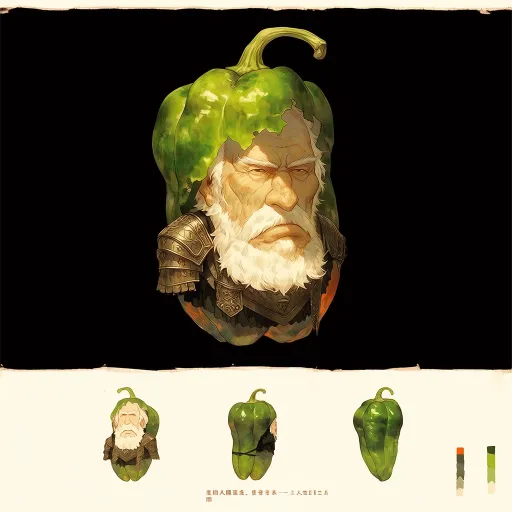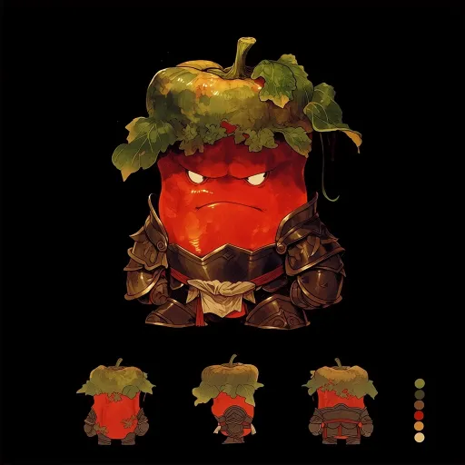 Midjourney Bot 更新时间:2026-03-18 00:00面展示一只拟人化的辣椒生物,老年形态,带有自然纹理。整体形象圆润、身穿古代盔甲表情冷漠,背景为黑底,营造自然与神秘结合的视觉冲击。下方以三视图形式展示角色的正面、侧面与背面,标注配色方案。。整体风格为水墨风,,融合自然幻案。。整体风格为水墨风,,融合自然幻 --ar 1:1 --stylize 100 --niji 7