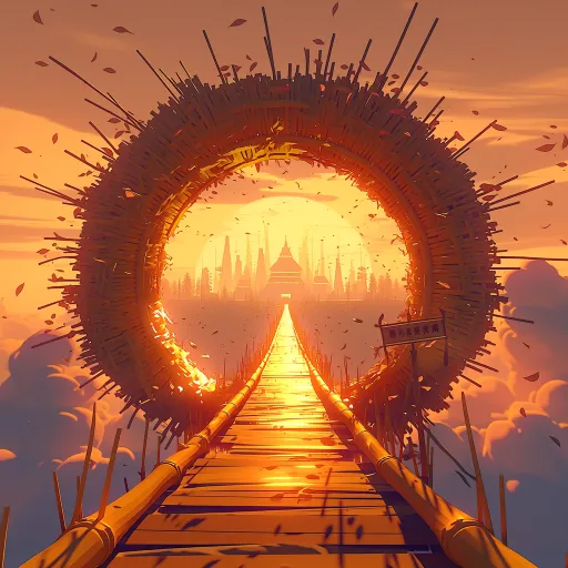 Midjourney Bot 更新时间:2026-03-18 00:02在夕阳环境的高山顶上一条小路笔直通向一个有许多粗竹子组成的有设计造型感半圆形的暖色调的巨大大门,大门四周围是云遮蔽大门里面景象是俯视下方竹林中一个夕阳下许多建筑的奇幻熊猫世界顶背光轮廓剪影,大门有体积光,大门上牌子写着熊猫世界,,环境中飘散着许多竹叶,卡通游戏风格化,造型简约概括有趣夸张,皮克斯3d动画渲 染风格,16:9 3d游戏画面 --ar 1:1 --stylize 100 --niji 7