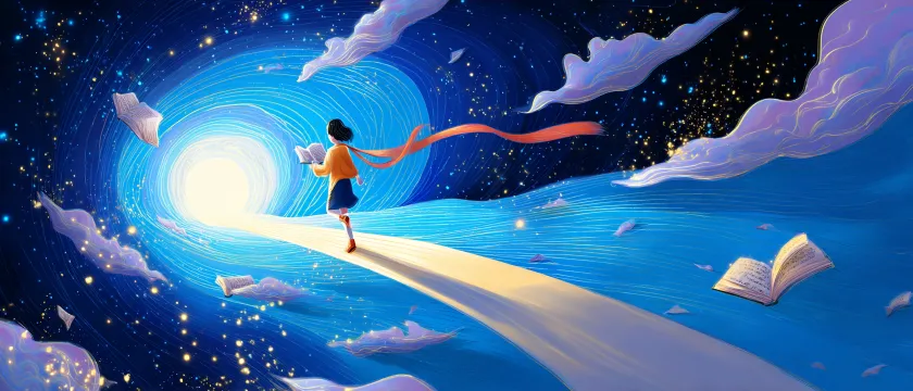 Midjourney Bot 更新时间:2026-03-18 00:03https://images.gogpt.vip/aigf/m_origin/20251223/1993421/y0t6shehmc9x8wio.png https://images.gogpt.vip/aigf/m_thumbnail/20260317/1993421/kfjxqq9zp0emitrb.webp 一条金色的光轨通向地平线,象征着希望与全新启程。一位穿着橙色上衣、深蓝色短裤和橙色鞋子的少年正奋力奔跑,他手中拿着书本,背后飘着一条红色的丝带,仿佛是胜利的象征。,背景是一片湛蓝的天空,点缀着洁白的云朵。前方有一道仿佛隧道或入口般的开口。道路两侧,有书本像树叶正轻盈地飘向空中,暗示着微风拂过。沿途,金色的微粒如繁星般闪烁,在蓝色天幕下熠熠生辉——整体呈现出简洁、极简的美学风格。 --ar 21:9 --v 7 --stylize 100 --iw 2