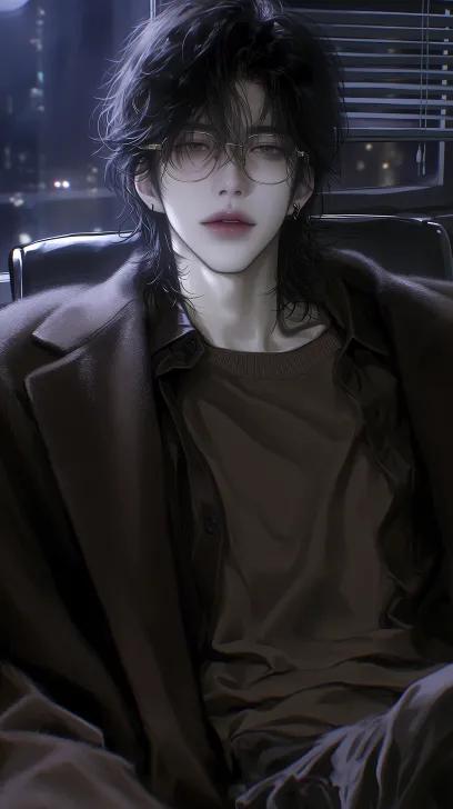 Midjourney Bot 更新时间:2026-03-18 00:03高级CG bjd 成年男性 高级厚涂 头发蓬松发丝凌乱 高清画质 光从侧面打过来 刘海过眉 冷白皮 耳环 眼尾向下 高鼻梁 薄唇 漫画感 涂画风 细腻晕染 朦胧 面部柔焦 高分辨率 笔触 插画 不羁 叛逆 嘴唇水润 俯视 立体打光 黑色长发 人物放大脸部特写 冷色调 背景室内 落地窗 窗外是夜景 人物坐在办公椅上 金丝细框眼镜 外套:深咖色宽松落肩款毛呢大衣,版型偏oversize,翻领设计,面料带有细腻的毛绒质感,自带慵懒高级感,长度及膝,能很好地修饰身形比例。 • 内搭:采用叠穿思路,内层是浅卡其色圆领打底衫,外层搭配一件深棕色翻领衬衫,衬衫领口微敞、下摆自然垂坠,营造出随性的层次感。 --ar 9:16 --stylize 800 --niji 7
