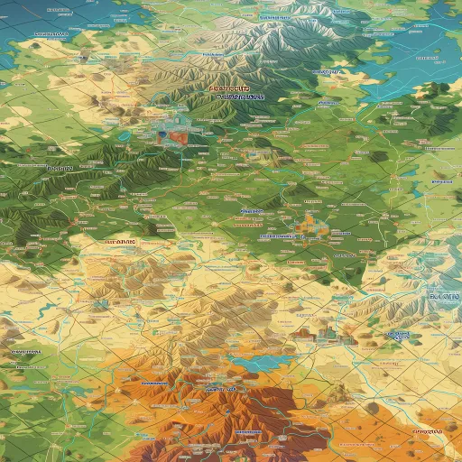 Midjourney Bot 更新时间:2026-03-18 00:05开放世界游戏内安全区地图,2D俯视图,写实清晰风格,上北下南,无现实大陆轮廓。北部山区、西部大森林、西南沙漠、中央丘陵废墟、中南部平原;东部海峡与东部防线,东北联盟主城,东南南港,西北营地,西侧西城区工业区。精准标注势力范围、安全等级色块、贸易区、商队路线、据点名称。配色克制有层次,道路网格清晰,图标简洁标准化(联盟、方舟、营地、危险区、安全区UI图标),地形起伏明显,游戏UI质感,高清8K,可读性极强 --ar 1:1 --stylize 100 --niji 7