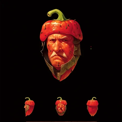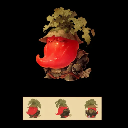 Midjourney Bot 更新时间:2026-03-18 00:06面展示一只拟人化的辣椒生物,整体为红色,头顶生长苔藓形成古代侠客草帽,表面柔软细腻,带有自然纹理。整体形象圆润、身穿古代盔甲表情冷漠,背景为黑底,营造自然与神秘结合的视觉冲击。下方以三视图形式展示角色的正面、侧面与背面,标注配色方案。。整体风格为水墨风,,融合自然幻 --ar 1:1 --stylize 100 --niji 7
