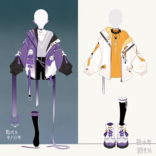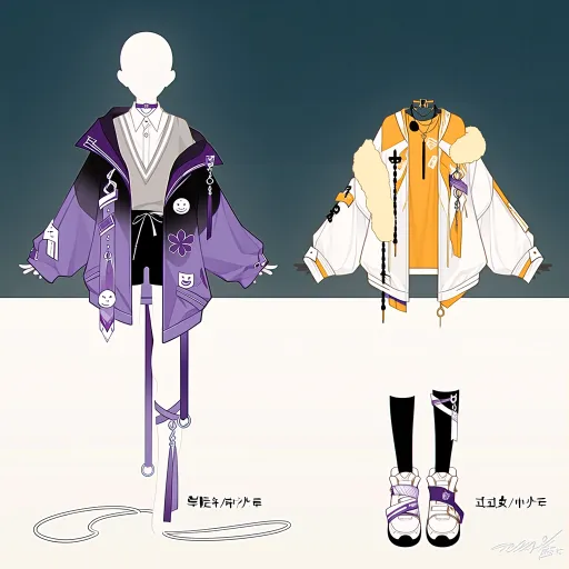 Midjourney Bot 更新时间:2026-03-18 00:07https://images.gogpt.vip/aigf/m_thumbnail/20260317/1686785/zw9byphc5u951azx.webp 左侧:紫黑渐变甜酷机能学院风服设 整体风格 以深紫、曜黑、灰白为主调,融合渐变撞色与机能工装细节,营造出甜酷利落的「学院少年/少女」气质,像是偏爱个性穿搭、带点叛逆感的学生角色,兼具学院感与街头机能感。 服饰细节拆解 - 颈部配饰: 佩戴紫色细项圈(缀银色圆环),叠戴白色颈饰,弱化甜感,注入利落的街头感。 - 上衣层次: 内搭白色立领衬衫,外搭浅灰色V领内搭;最外层是紫色和白色拼色连帽机能外套:肩部为黑色撞色,衣身从深紫渐变至黑色,袖口为纯紫色,缀白色圆形纽扣、紫色四叶草贴布、笑脸表情贴布,还垂挂紫色飘带与金属挂饰,充满机能感与学院甜酷氛围。 - 下装与鞋袜: 黑色修身短裤,腰部系白色抽绳,大腿处缠绕紫色环带;腿部搭配黑色中筒袜,左腿袜口缀紫色圆环装饰;脚穿白紫拼色厚底靴,靴身饰白色波浪纹与金属扣环,鞋带为紫色,鞋底黑紫渐变,适配日常出行与个性穿搭场景。 右侧:白橙服设 整体风格 以纯白、暖橙、浅黄、黑金为主调,营造出温润雅致的「中式少年」气质,像是偏爱传统美学、性格沉稳的角色,兼具中式韵味与现代宽松感。 服饰细节拆解 - 上衣层次: 内搭暖橙色T恤,有白色项链;外搭白色和橙色拼接长款开衫:肩部与袖口为浅黄毛绒拼接,衣身饰金色盘扣、黑色珠串项链(叠戴金色链条)、橙色圆环挂饰与圆形金属徽章,下摆开叉设计,版型宽松飘逸,弱化中式服饰的厚重感,注入现代松弛感。 - 核心标识: 立领盘扣、金色纹样、珠串配饰,精准锚定「新中式」的角色设定,凸显温润儒雅的气质。 --ar 1:1 --iw 2 --niji 7
