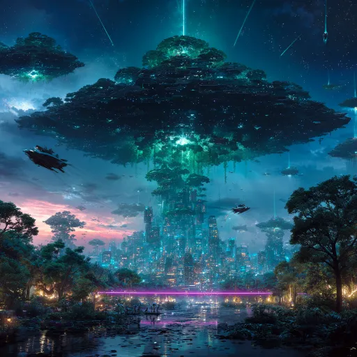 Midjourney Bot 更新时间:2026-03-18 00:07科幻电影场景设计,9:16竖向画幅。**【画面下方】是傍晚时分的生物形态未来都市,建筑如同巨大的发光植物般生长,闪烁着柔和的青色与紫色霓虹光,整洁的无人机航线像流星一样交织。【画面上方】是一个巨大的液态金属悬浮体,形态如同流动的黑色水银,表面极度光滑并反射着地面的灯火,它正在缓慢吞噬周边的积雨云,显得诡异而先进。【细节】**画面中间通过一条微弱的紫色光束连接上下两界,象征唯一的权限通道。后生物科技风格,超现实主义,柔光氛围,复杂的流体动力学表现,神秘感。 --ar 1:1 --v 7 --stylize 100
