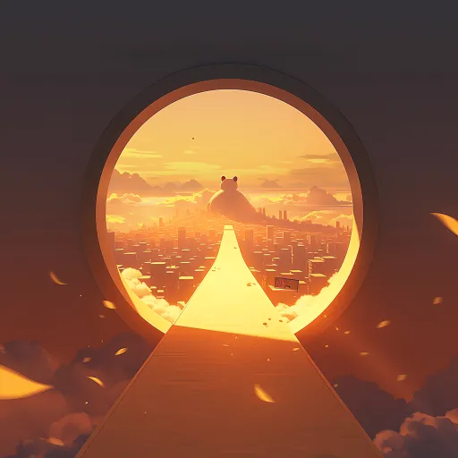 Midjourney Bot 更新时间:2026-03-18 00:08在夕阳环境的高山顶上一条小路笔直通向一个有设计造型感半圆形的暖色调的巨大大门,大门四周围是云遮蔽大门里面景象是俯视下方竹林中一个夕阳下许多建筑的奇幻熊猫世界顶背光轮廓剪影,大门有体积光,大门上牌子写着熊猫世界,,环境中飘散着许多竹叶,卡通游戏风格化,造型简约概括有趣夸张,皮克斯3d动画渲 染风格,16:9 一个奇幻熊猫主题3d游戏画面 --ar 1:1 --stylize 100 --niji 7
