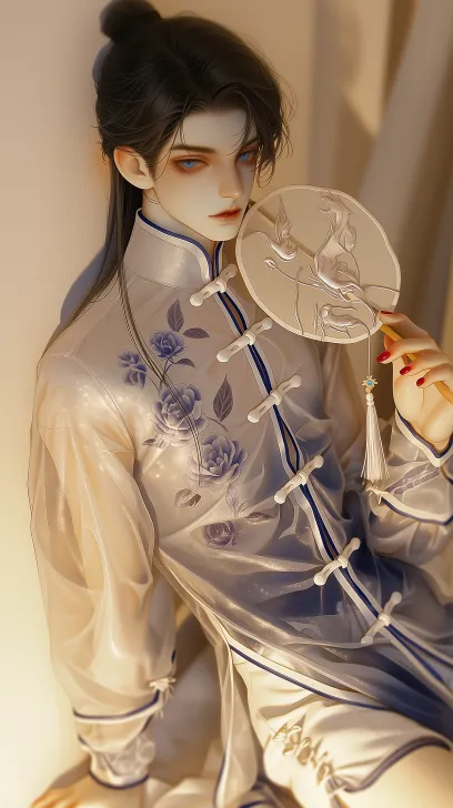 Midjourney Bot 更新时间:2026-03-18 00:08一个黑色长发帅哥,头发一根玉簪挽起,五官精致,琉璃质感的湖蓝色双眸深邃,光泽饱满玻璃唇,漫画真人质感,冷白皮,精致钻石脸 服装:国风修身半透明欧根纱旗袍,米白半透明欧根纱雾霾蓝渐变长款纱裙,白色盘扣,胸前深紫花卉刺绣,袖口与领口蓝边勾勒,内搭白色系带短裤 配饰:手持绣着花鸟的米白团扇,配白色流苏,指甲涂红指甲油 构图:中近景,人物侧身倚靠墙面,一手扶墙一手持扇,欧根纱朦胧感 光影:暖调侧光,柔和暧昧氛围,突出皮肤与欧根纱的透明与光泽质感 风格:细腻半厚涂,BJD质感,超写实风格,东方古典韵味与现代结合,禁欲又魅惑,高级氛围感 --zoom 1.5 --ar 9:16 --stylize 100 --niji 7 --no 胡子,文字,Logo,不完美肢体,仰头