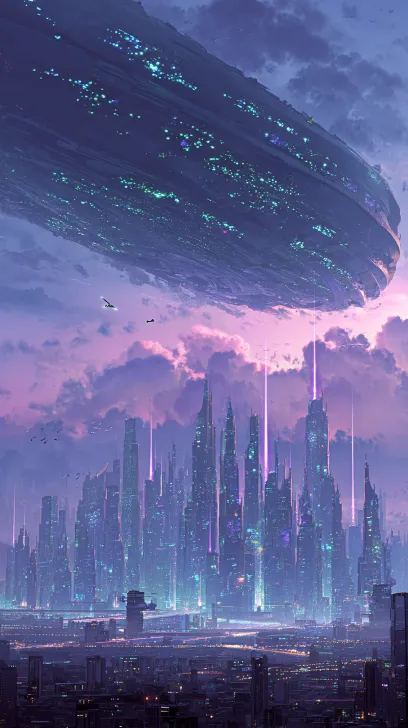Midjourney Bot 更新时间:2026-03-18 00:10科幻电影场景设计,9:16竖向画幅。**【画面下方】是傍晚时分的生物形态未来都市,建筑如同巨大的发光植物般生长,闪烁着柔和的青色与紫色霓虹光,整洁的无人机航线像流星一样交织。【画面上方】是一个巨大的液态金属悬浮体,形态如同流动的黑色水银,表面极度光滑并反射着地面的灯火,它正在缓慢吞噬周边的积雨云,显得诡异而先进。【细节】**画面中间通过一条微弱的紫色光束连接上下两界,象征唯一的权限通道。后生物科技风格,超现实主义,柔光氛围,复杂的流体动力学表现,神秘感。 --ar 9:16 --v 7 --stylize 100