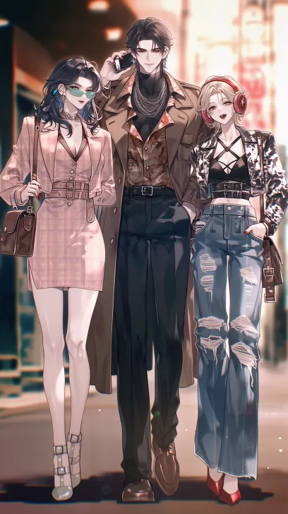 Midjourney Bot 更新时间:2026-03-17 00:13三人时尚都市CP组,整体风格复古甜酷融合,充满张力: 【左侧女性】:175cm高挑御姐,深黑色带蓝挑染的中长卷发,额前碎发垂落,佩戴浅绿色墨镜,身穿粉色格纹宽松西装外套+深V内搭+同格高开叉半身裙,腰间双皮带装饰,搭配灰色绑带高跟靴,肩挎棕色复古邮差包,气质冷艳又甜酷。 【中间男性】:190cm高挑清瘦,深黑色顺直中短发,身穿卡其色长款风衣+复古花纹马甲+黑色高领内搭+黑色西裤,脚踩棕色皮鞋,颈部叠戴多条银链项链,耳戴银色耳钉,一手举着手机通话,一手轻搭身侧,气质慵懒又绅士。 【右侧女性】:172cm甜酷少女,浅金色齐耳短发,佩戴红色复古耳机,身穿黑白泼墨短款西装外套+黑色绑带内衣+蓝色破洞喇叭牛仔裤,腰间双皮带与腿带装饰,脚踩红色尖头高跟鞋,气质甜酷又充满街头感。 背景:韩国街头 光线:暖调侧光,在人物面部与服饰上形成细腻高光,突出复古甜酷的时尚氛围。 镜头:平视角度全身景,三人居中站位,构图饱满,浅景深,人物清晰,背景虚化,强调三人互动的时尚大片质感。 韩式二次元写实厚涂风格,线条硬朗,光影细腻,布料与配饰质感真实,高饱和粉/卡其/蓝/黑配色,细节精致,氛围感拉满。 --ar 9:16 --c 17 --weird 4 --stylize 100 --niji 7