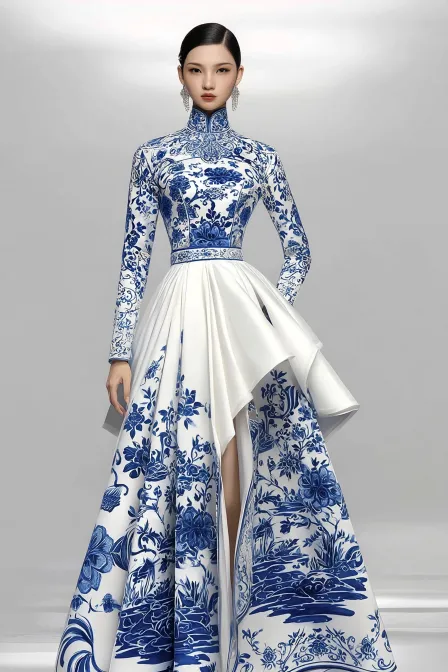 Midjourney Bot 更新时间:2026-03-17 00:14https://images.gogpt.vip/aigf/m_origin/20260317/2080877/uj8oghly3kfs3xp8.jpg 新中式青花瓷主题高级定制时装,以经典青花蓝与温润白为主色调,融入传统缠枝莲、山水、冰裂纹等经典纹样,采用缎面、欧根纱、网纱等通透飘逸材质,结合立体剪裁与解构设计,呈现优雅修身的廓形,兼具东方古韵与现代时装质感,纯白背景,高清细节,高级时尚大片风格。 --ar 2:3 --v 7 --stylize 100 --iw 0.25 --sref https://images.gogpt.vip/aigf/m_origin/20260317/2080877/uj8oghly3kfs3xp8.jpg --oref https://images.gogpt.vip/aigf/m_origin/20260317/2080877/uj8oghly3kfs3xp8.jpg --ow 41 --sw 42