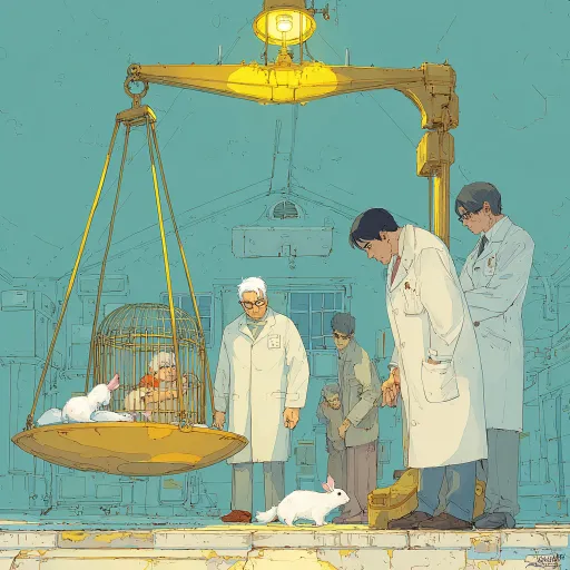 Midjourney Bot 更新时间:2026-03-17 00:14宫崎骏风格,日式动画插画,俯视视角,医院病房, 巨大黄铜天平,一端是铁笼中的白色实验小鼠,一端是病床的老人与孩子, 暖黄聚光灯,冷蓝背景,白大褂科研人员记录,地面有白兔, 庄重温暖的氛围,隐喻实验动物为人类健康做出的牺牲, 清晰线条,柔和色彩,高分辨率,风格 raw --ar 1:1 --v 7 --stylize 100