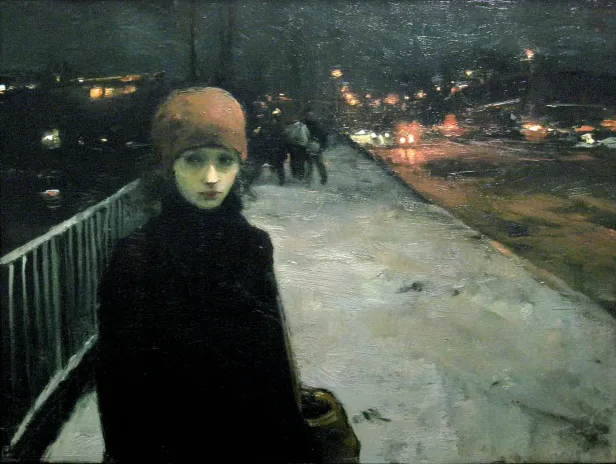 Midjourney Bot 更新时间:2026-03-17 00:17https://images.gogpt.vip/aigf/m_origin/20260317/1911862/fchumydv1mh00q23.jpeg 写实主义油画,色调偏暗的都市夜景,笔触厚重带肌理感,类似印象派与现实主义结合的街头写生风格 前景是一位裹着深色大衣、戴着浅棕兜帽的年轻女性,面部被阴影与兜帽半遮,神情疏离沉静,肩上挎着单肩包,站在湿漉漉的人行道边缘。背景是冬夜的城市街道,地面因潮湿而反射着路灯与车流的暖光,远处有模糊的行人剪影与朦胧的街灯光晕,左侧有金属护栏,整体氛围清冷、孤寂又带着都市夜晚的暧昧感。以深褐、墨绿、藏蓝等暗色调为主,点缀暖黄路灯与冷白路面反光,明暗对比强烈,重点突出人物轮廓与地面反光的质感,营造静谧又略带忧郁的情绪。 保留油画质感与笔触纹理,画面颗粒感适中,构图为人物偏左、街道延伸向远方的视角,避免过度锐化,保持朦胧的夜晚氛围感。 --ar 4:3 --v 7 --stylize 100 --iw 0.25 --sref https://images.gogpt.vip/aigf/m_origin/20260317/1911862/fchumydv1mh00q23.jpeg