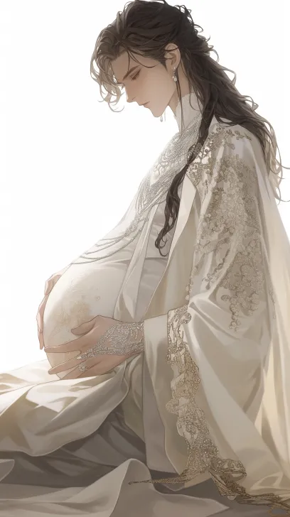 Midjourney Bot 更新时间:2026-03-17 00:24怀孕,一名英俊俊美的身穿白色露背刻丝软烟罗汉服的动漫男性,侧身镜头,跪着地上,跪着,刺绣花纹+八宝纹+宝相花纹+云纹、水纹、青莲、海棠、藤蔓、山水纹,身穿披挂、珍珠级联抹、镶嵌着宝石、绣着珍珠和莱茵石、挂着链子,白色背景,随机点,多次曝光摄影玫瑰,柔光,长发,线条流畅➕阴影柔和,胶片颗粒感,长发,,在灰暗的房间里,脸上有阴影,黑色的头发,肌肉发达,黑色嘴唇,高角度拍摄,全身肖像, --ar 9:16 --style raw --stylize 100 --niji 6