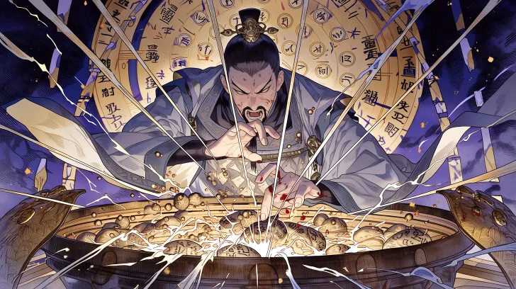 Midjourney Bot 更新时间:2026-03-17 00:27medium shot 中景,国漫宿命史诗分镜,16:9 画幅,国风玄幻修仙漫画风格,28 岁眉目深邃、气质温润的天机卜算师男主,墨发高束配玉冠,身着青灰广袖道袍,立于宗门天机台的巨大龟甲卜算盘前,双手死死按住正在炸裂的卜算龟甲,强行逆转盘上显示的宗门灭门卦象,天幕劈下紫霄天道雷劫狠狠劈在男主身上,他周身撑起金色护罩咬牙硬抗,嘴角溢血眼神却无比坚定,背景是庄严肃穆的天机台,刻满天干地支的卜算盘,浩瀚星空天幕,翻涌的雷云,紫蓝与暗金撞色,强宿命冲突,工笔国风线稿,水墨厚涂质感,悲壮氛围感拉满,极致细节,2K 画质 --ar 16:9 --stylize 220 --niji 7