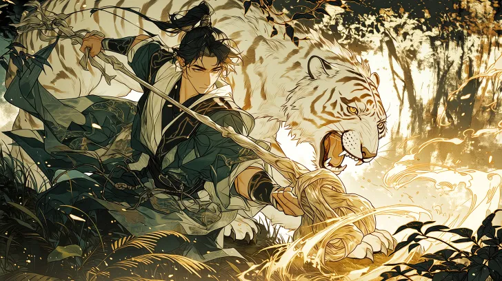 Midjourney Bot 更新时间:2026-03-17 00:27medium shot 中景,国漫高燃打斗分镜,16:9 画幅,国风玄幻修仙漫画风格,28 岁剑眉朗目、气质桀骜的御兽大宗师男主,高束马尾,身着墨绿镶兽纹劲装,手持兽骨长鞭,侧身立于万兽谷的密林之中,与身侧通体雪白的契约白虎并肩而立,长鞭挥出灵力藤蔓困住对面的灵兽偷猎者,白虎张口喷出金色灵力光波击碎偷猎者的法宝,背景是遮天蔽日的原始密林,满地珍稀灵草,被解救的幼兽缩在男主身后,透过树叶洒下的斑驳日光,暖绿与鎏金撞色,强伙伴羁绊氛围感,锐利洒脱的国风线稿,水墨厚涂质感,高燃打斗感拉满,极致细节,2K 画质 --ar 16:9 --stylize 220 --niji 7