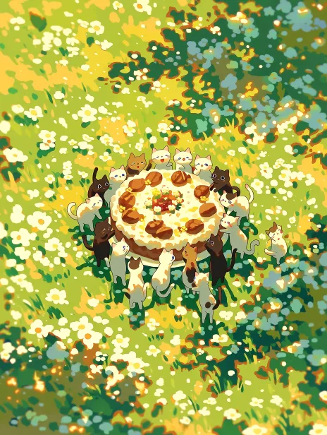 Midjourney Bot 更新时间:2026-03-17 00:28一群品种各异的可爱小猫围绕蛋糕跳舞。场景是在一个被鲜花环绕,春日花园里 --ar 3:4 --c 16 --stylize 156 --niji 7