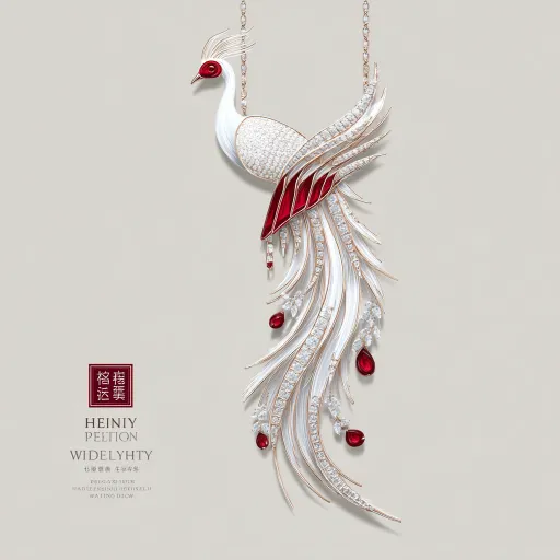 Midjourney Bot 更新时间:2026-03-17 00:31哈尼族白鹇鸟项链现代化设计稿,提取白鹇鸟特征:长而洁白的尾羽,红色的脸,羽毛上的“V”字型纹理。要有设计感,线条灵动优美,抽象几何,融合哈尼族白鹇鸟文化内涵,极简轻奢风格,细节精致,高级感,珠宝设计效果,适合艺术院校毕业设计。材料考虑:金属绕线工艺。重心设计尾羽、羽毛,弱化整体鸟的外观造型 --ar 1:1 --v 7 --stylize 100