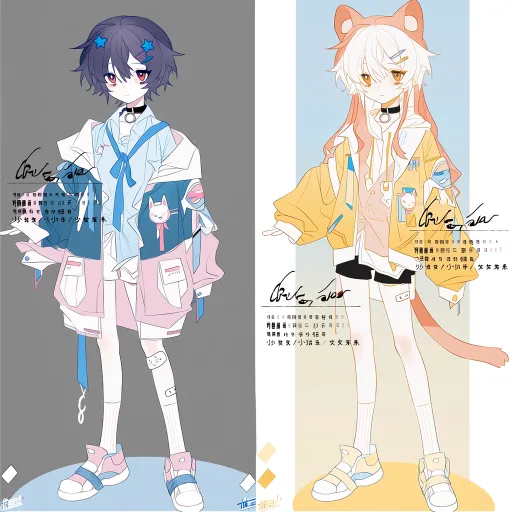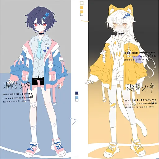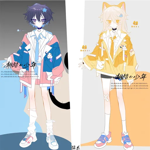 Midjourney Bot 更新时间:2026-03-17 00:34https://images.gogpt.vip/aigf/m_origin/20260316/1686785/94mz7m0l2ers8pyh.jpg 左侧:蓝粉甜酷机能风服设(少年/中性款) 整体风格 以浅蓝、柔粉、纯白为主调,融合撞色与萌系机能细节,营造出软萌又利落的「潮酷少年」气质,像是偏爱清新穿搭、自带灵动个性的角色,兼具甜美元气与机能干练感。 服饰细节拆解 - 头部与特征: 深紫蓝蓬松短发,佩戴蓝色星星状发夹,眼眸为深邃红瞳,眼神灵动锐利;颈部系黑色细项圈(缀银色圆环),弱化甜感,注入街头利落感。 - 上衣层次: 内搭浅蓝立领衬衫,领口系粉色细领带,增添学院软萌氛围;外搭蓝色和粉色和白色拼接宽松机能外套:衣身以浅蓝为基底,下摆与袖口为柔粉,有白色贴布、粉色装饰飘带与立体口袋,左袖点缀白色小幽灵别针,袖子为宽松版型,兼具机能感与萌趣细节。 - 下装与配饰: 白色修身短裤,腰部垂坠蓝色绑带,大腿处贴有白色创可贴装饰,清爽又带点小个性;腿部搭配白色中筒袜,袜身做褶皱设计,增加松弛感。 - 鞋履: 粉蓝白拼色厚底休闲鞋,鞋带为蓝色,鞋头圆润粉嫩,厚底设计适配日常出行,强化甜酷少年感。 右侧:黄橙撞色萌系猫耳机能风服设(少女/中性款) 整体风格 以姜黄、橙黄、纯白为主调,融合猫耳兽耳元素与机能工装细节,营造出元气软萌的「猫系少年/少女」气质,像是灵动活泼、自带治愈感的角色,兼具萌系可爱与机能实用性。 服饰细节拆解 - 头部与特征: 白色长直发,头顶立着一对橙色猫耳(内侧带粉色渐变),眼眸为暖橙瞳,自带灵动萌感;发间点缀蓝色一字发夹、黑色小猫挂饰与圆环配饰,颈部系橙色项圈(缀小铃铛坠饰),精准锚定「猫系」主题。 - 上衣层次: 内搭姜黄水手领上衣,领口系蓝色细领结,注入学院甜美元气;外搭黄色和白色拼色宽松机能外套:衣身以姜黄为主,肩部与袖口为白色拼接,饰有蓝色圆形纽扣、立体口袋与黑色小猫贴布,袖子为白色宽松内搭+黄色外套叠穿,层次丰富,适配软萌与机能兼具的设定。 - 下装与配饰: 黑色修身短裤,腰部与大腿处缠绕蓝色绑带、白色交叉绳带,利落干练;腿部线条纤细,与上装的暖色调形成清新对比。 - 鞋履: 黄橙白拼色厚底休闲鞋,鞋带为白色,鞋头缀黄色小熊装饰,厚底设计轻便百搭,与整体猫系萌感高度契合。 --ar 1:1 --iw 2 --niji 7