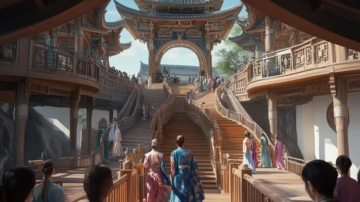 Midjourney Bot 更新时间:2026-03-16 00:22https://images.gogpt.vip/aigf/m_origin/20260315/562449/g1m2nh426eblmgru.jpg 平视中景,木质雕花楼梯上,身着蓝粉古装的行人缓步走向戏台,观众倚栏驻足观望,戏台檐角纹饰清晰,背景可见古典牌坊,暖调自然光,古风写实,场景细节连贯。要求和提供的垫图风格一致。 --ar 16:9 --v 6.1 --style raw --seed 546065040 --stylize 200