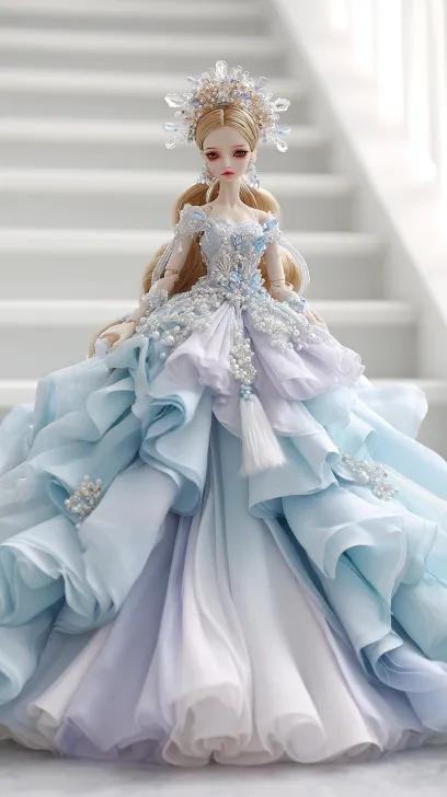 Midjourney Bot 更新时间:2026-03-16 00:24BJD美少女水冰月公主娃娃,超级重工复杂重工华丽的发型主体呈现全部由头发编制的的复杂造型,细节丰富,包含多层的精致结构,整体设计华丽重工,线条流畅细腻,全部由头发编制而成,发型上点缀着精美华丽的发饰珍珠水晶流苏装饰,精美的珍珠妆容,花仙子元素,精美华丽超级重工的装饰着各种宝石水晶流苏许多飘带装饰着大拖尾大裙摆设计的粉蓝白色多层礼服服饰,1:9的身高比例,全身站立在白色台阶上展示着,白色背景。比例 9:16。 --ar 9:16 --v 7 --stylize 100