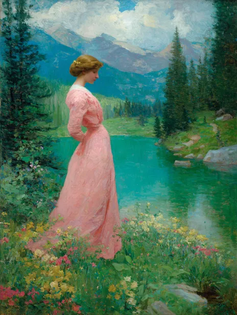 Midjourney Bot 更新时间:2026-03-17 00:00以James Abbott McNeill Whistler的画作为参考,一个穿长粉色裙的美丽女人,金色的头发,森林湖,地上长满鲜花,天空是蓝色的,白云,远处的山和树。 --ar 3:4 --v 7 --stylize 100