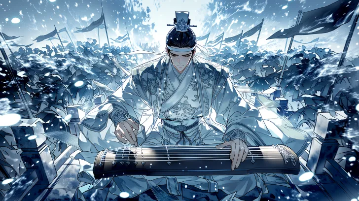 Midjourney Bot 更新时间:2026-03-17 00:01medium shot 中景,国漫动态分镜,16:9 画幅,国风玄幻修仙漫画风格,28 岁眉目清冷、气质孤绝的音道大宗师男主,墨发高束配白玉发冠,身着月白绣云纹广袖仙袍,端坐于冰封的断桥桥头,双膝横放七弦古琴,指尖拨动琴弦,周身爆发淡蓝色音灵力化作半透明结界,将身后瑟瑟发抖的逃难百姓牢牢护在身后,琴音化剑劈开迎面冲来的魔军铁骑,背景是冰封的千里江面,漫天飞雪,远处魔军的黑色旌旗与翻涌的魔气,冷色调光影,强悲壮氛围感,锐利国风线稿,水墨厚涂质感,逆光金边勾勒人物轮廓,极致细节,2K 画质 --ar 16:9 --stylize 220 --niji 7